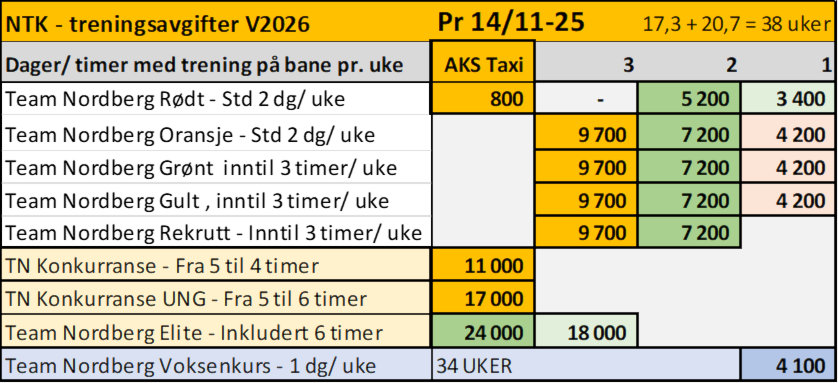 Treningsavgifter - priser høsten 2025 og våren 2026