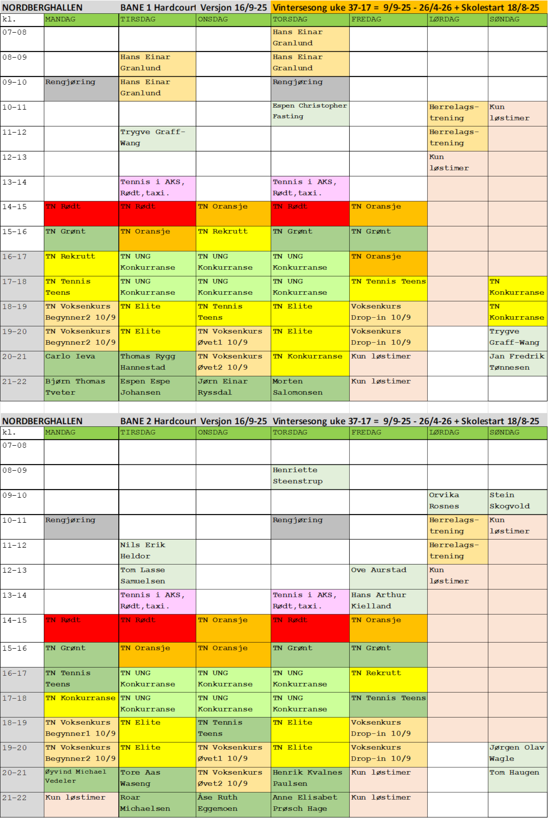 - Hvite felt er ledige for å booke som Faste timer for medlemmer i vintersesongen når bobla er oppe