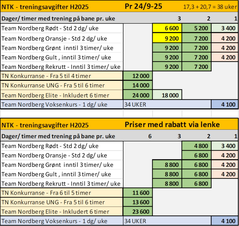 Unntaket var for konkurransegruppene hvor vi sommeren 2025 økte prisene på Elite med 24% og Lions med 34%. Begrunnelsen og oppbygningen er beskrevet under. På dette tidspunkt var ikke treningsplanen klar, og vi hadde heller ikke splittet Lions mellom "NT Konkurranse" og "NT Konkurranse UNG".