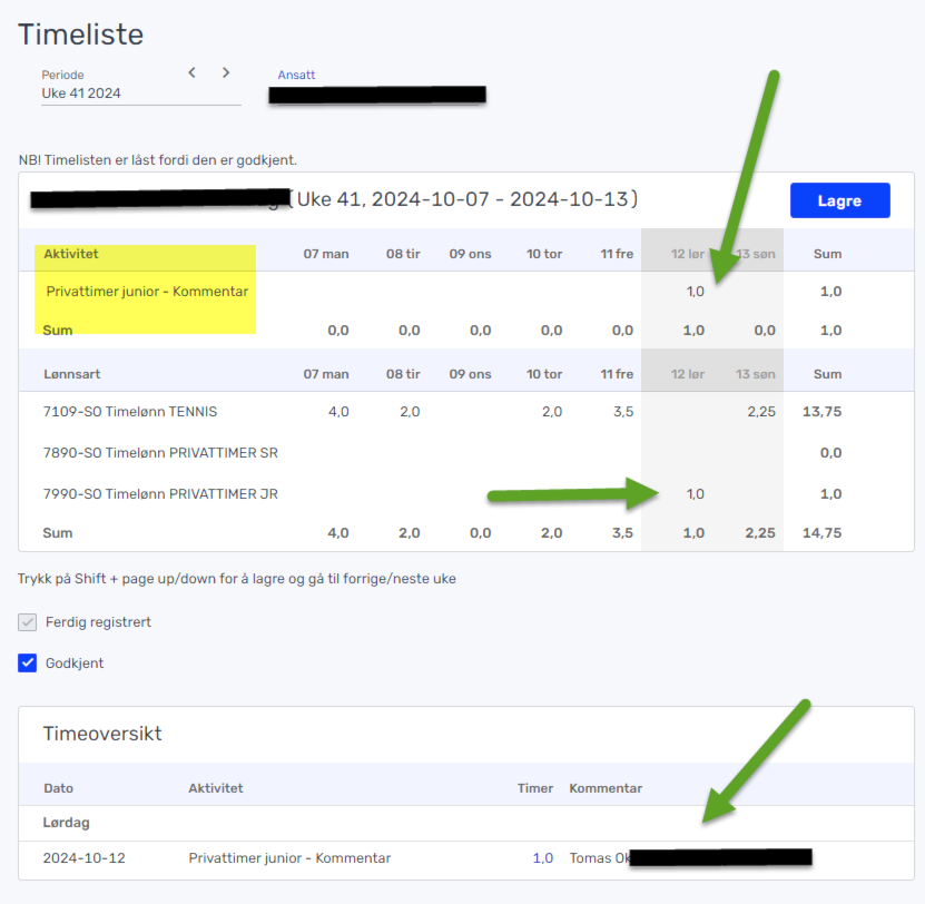 - Det står "Tennistimer - Kommentar" her, og dette skal være i tillegg til timer du legger inn som gir lønn, ref. info over