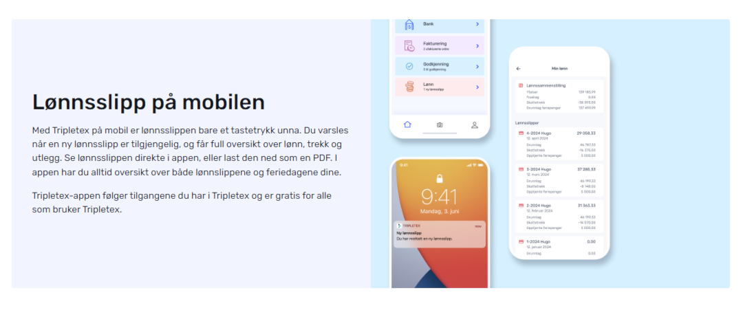 - For å se lønnsslippen må dere laste med Tripletex APP, se klipp under