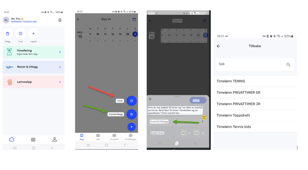 Slik gjør det det når du skriver timer - trinn for trinn - ref. klipp av skjermbildene fra appen under.
