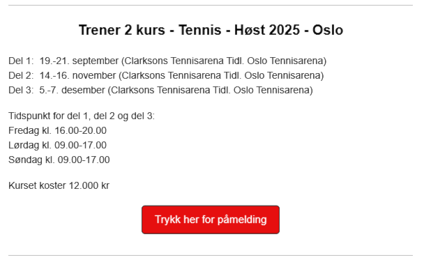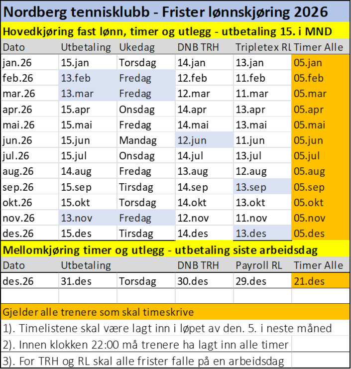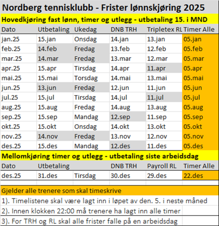 Det betyr at for de fleste trenerne så tar klubben ansvaret for at dere får et akseptabelt lønnsoppgjør hvert år. Men for de av dere som mener markedsverdien deres har økt siden i fjor, så er det lov å komme med et skriftlig innspill til meg via adm@nordbergtennis.no. Siden vi har nye hovedtrenerne på plass ifra august 2025, så vil nok Selma og André måtte få lov å danne seg et inntrykk i løpet av høstsemesteret før vi gjør noen lønnsjusteringer. Minner om at noe som normalt øker markedsverdien til trenere er økt formalkompetanse via trener 1 eller trener 2 kurs.