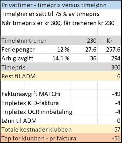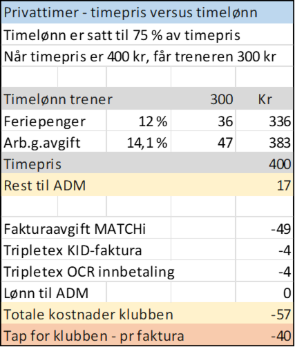 Det kommer tidvis spørsmål om hvor mye klubben "tar" av timeprisen, som regnestykket under viser så går alt tilbake til treneren i form av feriepenger og arbeidsgiveravgift som klubben må betale.